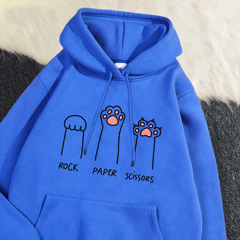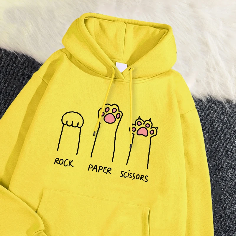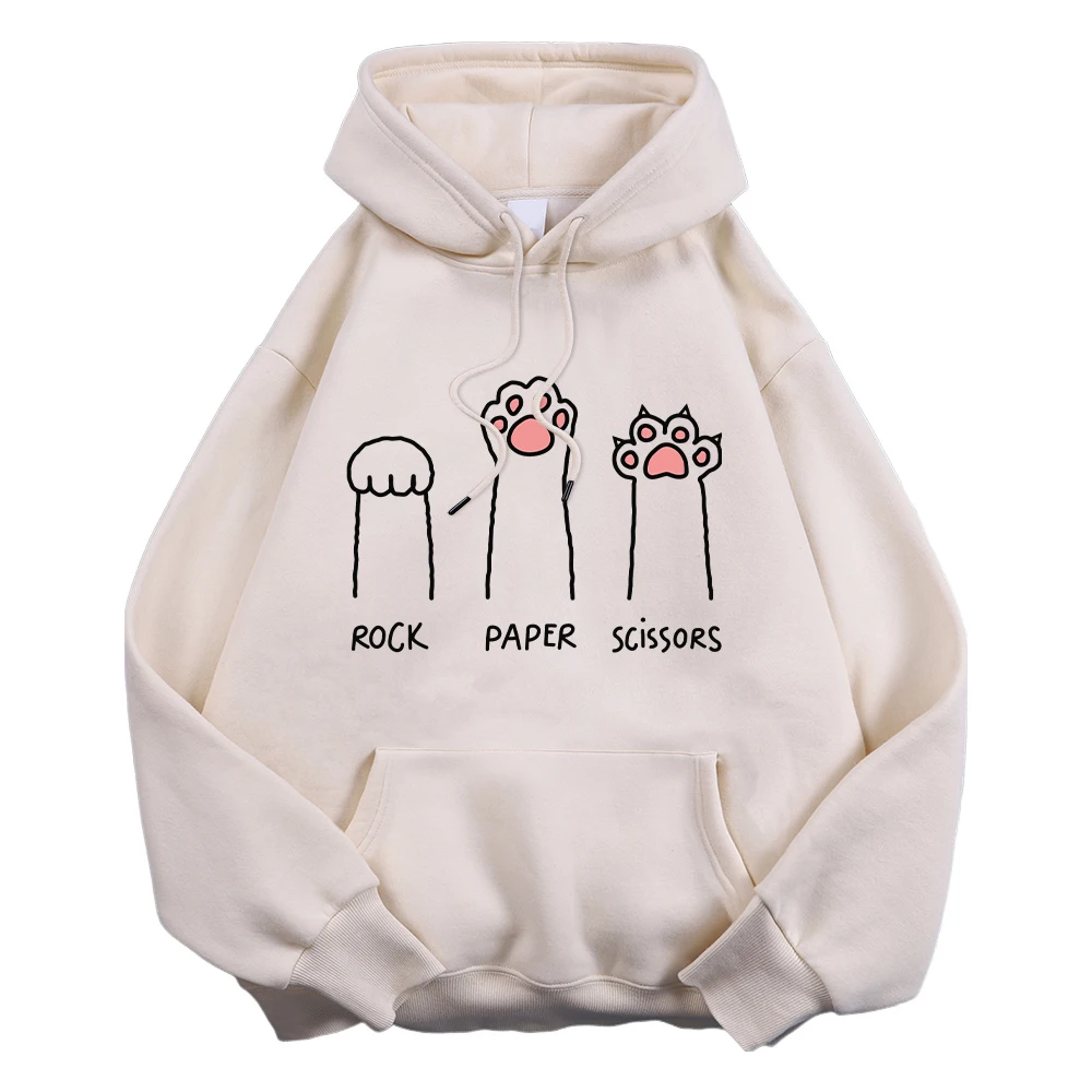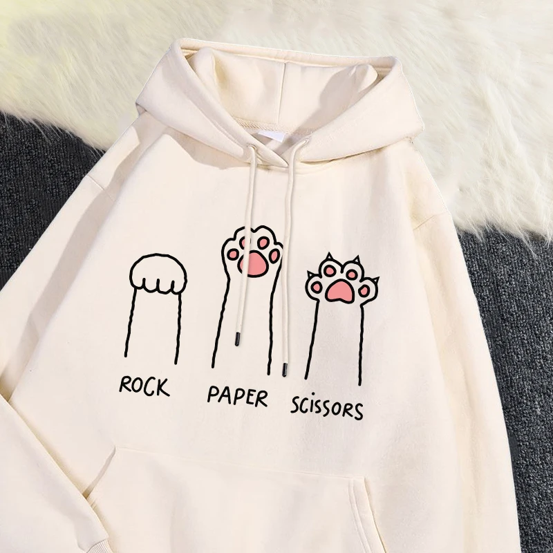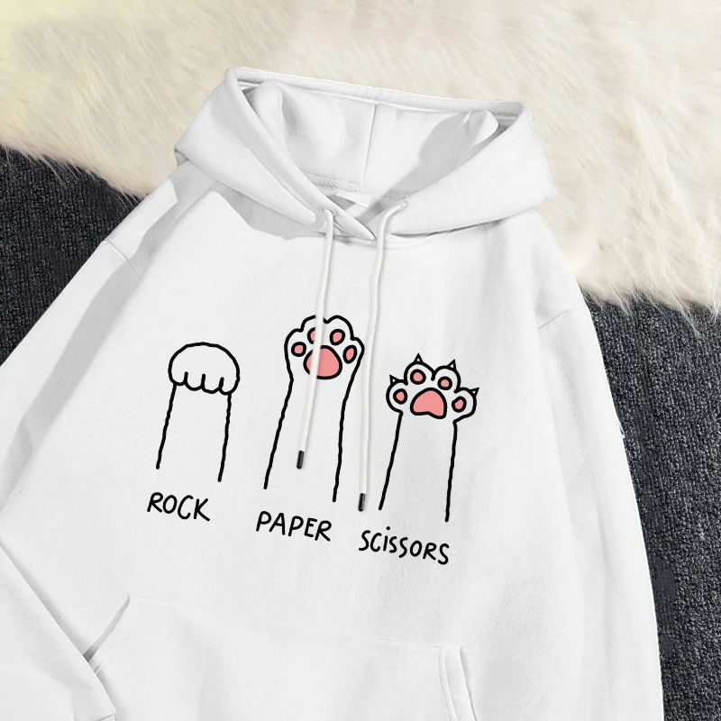 Kawaii Womans Hoodies Rock Paper Scissors Funny Cat Printing Pullover Soft Breathable Loose Sweatshirt Autumn Winter Sportswear